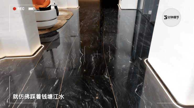 视线往下,脚下是完整的巴西太古青金石铺面,参照“伦敦泰特现代美术馆”风格,深浅纹理营造出波浪感,让地面大堂如潮水一般