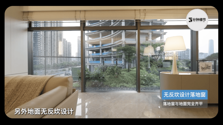 完全落地的玻璃幕墙和地面之间采用了无反坎工艺,整个地面变得无比平整的延伸,玻璃完完全全落地,让室内的视野真正无界