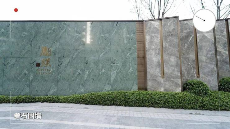 靠近社区第一眼,可以看到围墙上全是大面爱马仕灰奢石和大花绿奢石整板通铺,结合复杂的金属格栅线条过渡