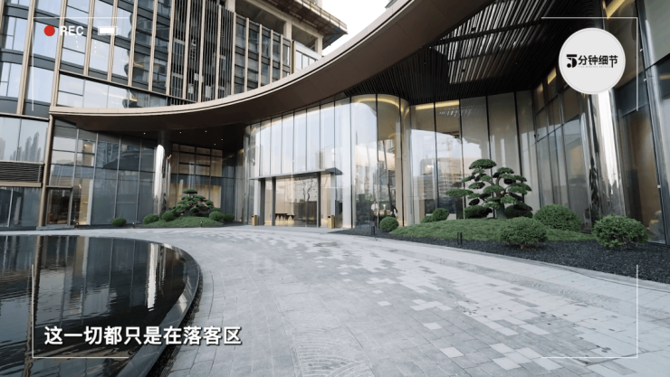 从门口还可以看到,1.5*7.8米的无立柱完整通透弧形玻璃幕墙,笼罩着整个大堂,大面玻璃本身造价极高,打造成完整的弧形更是难上加难