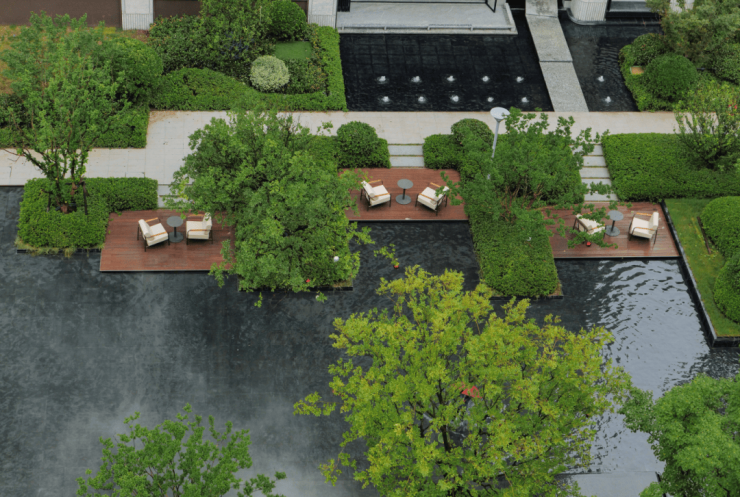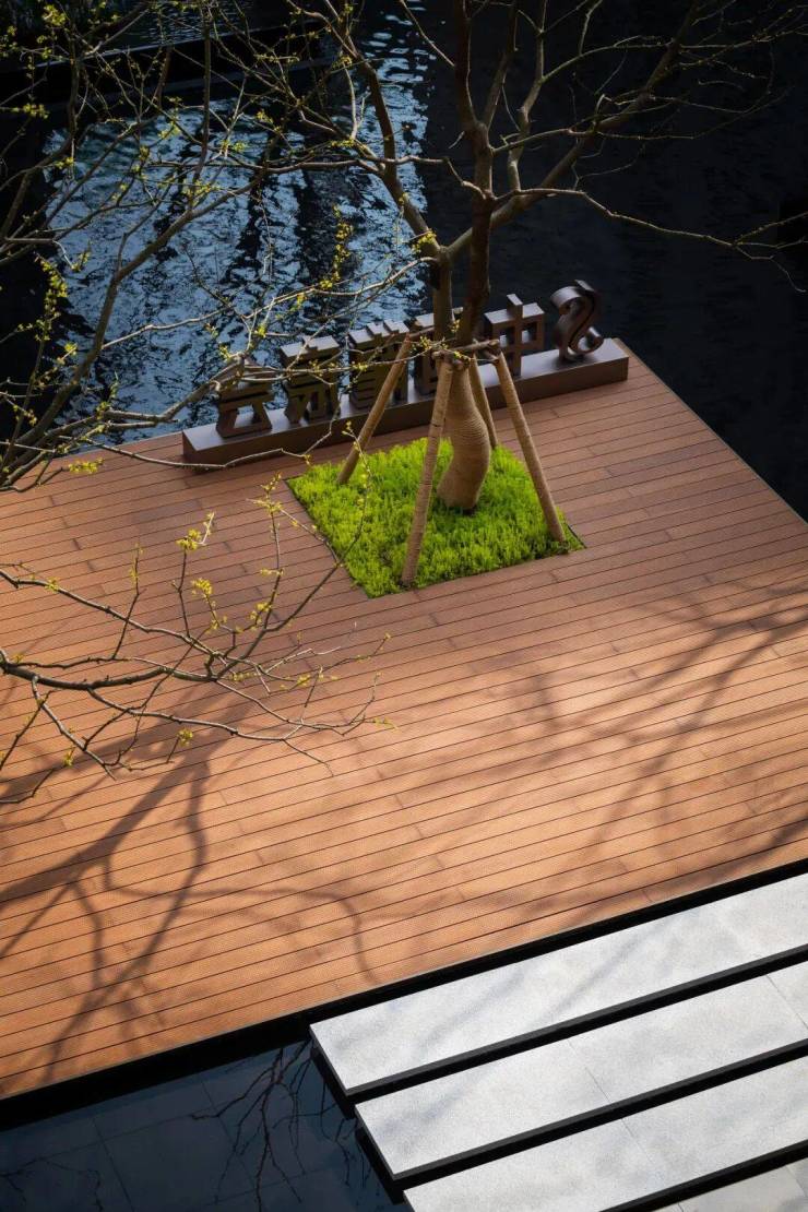 龍宸壹號北区风雨连廊的景观区域,迎宾水景与八棵形态各异的乌桕树相映成趣,营造出一种纯粹、舒适而又优美的林下空间氛围。