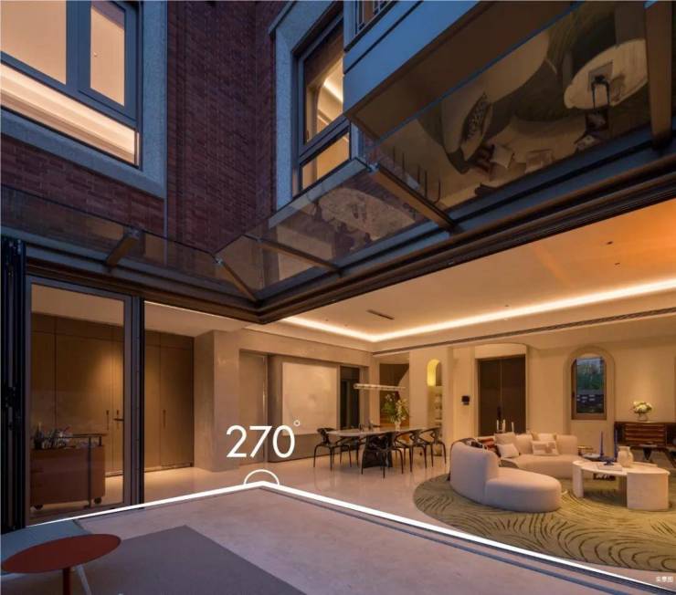 「无界空间」:客厅270度转角无柱设计,搭配落地玻璃,开阔视野将院中风景迎入日常。