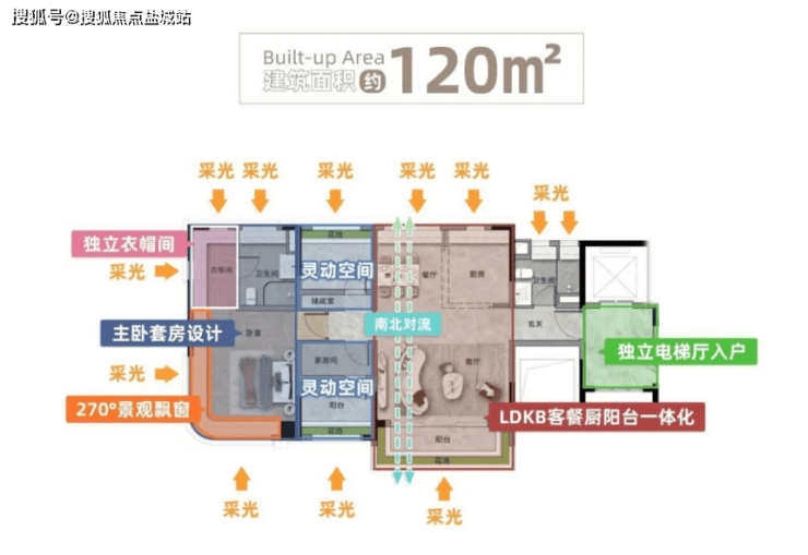 120㎡四房:4.5开间朝南,全屋采光面达16米,南北通透双视野,主卧带独立衣帽间。