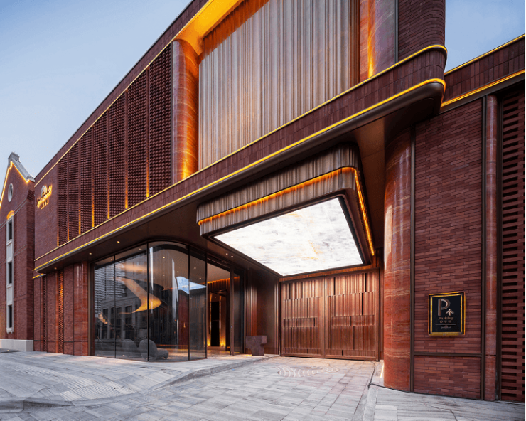 立面上跳跃的釉面砖,经喷釉、烧纹、淬火,流转出琉璃般的光泽,当夕阳掠过这些砖面,整座建筑便成了一首发光的诗。