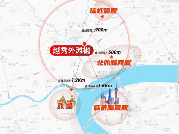 越秀外滩樾直线距离外滩源仅约1.2公里,直线距离北外滩商圈约500米,直线距离瑞虹商圈约900米,直线距离陆家嘴商圈约1500米!