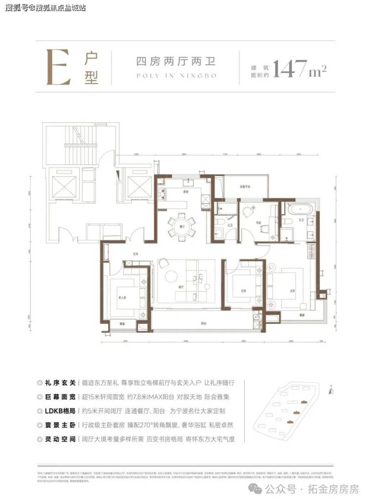 建面约147㎡E户型,奢阔四居,主卧套房 + IMAX级观景阳台,定义高阶改善标准。