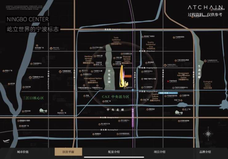 项目坐落于东部新城CAZ核心区,宁穿路与海宴路交汇处。正如宁波中心的名字一样,这里也是宁波的发展心脏。东部新城总占地15.85平方公里,以生态长廊为界,核心区域8.45平方公里 。