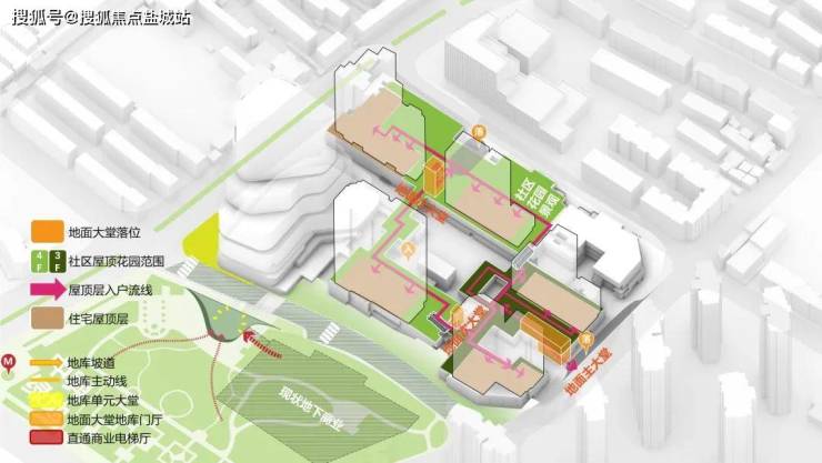 归家动线:建立在混合业态的基础上,住宅用户归家,可以通过专属独立大堂的艺术阶梯或者周边电梯,垂直抵达三层/四层归家花园道,实现情绪归家。在花园内可以通过风雨连廊实现无风雨归家。