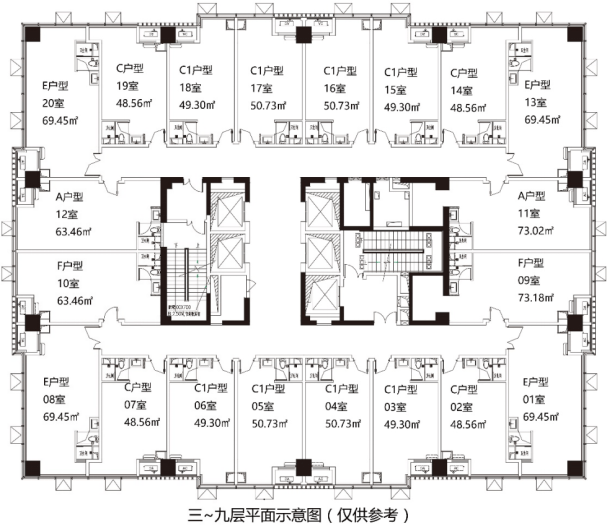 73m2产品:3+2房2厅2卫;东边户,每层仅2户。