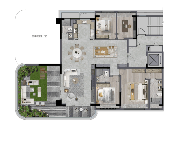 从入户的从容奢享、无界聚厅的场景交互,过渡到空中庭院的闲情逸致,让空间被一张无形的“生活织网”温柔连接,家人的情感与互动,在此自由流动、紧密共生。