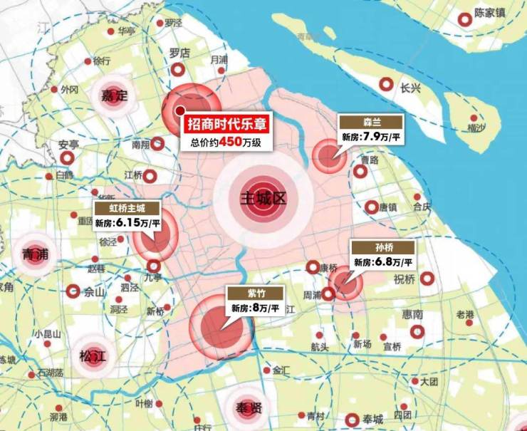 当然,这样的站位优势,当然也体现在房价上:虹桥、高行、紫竹等区域,起码都是6万+。就连顾村也已经出现了均价约6.38万/㎡的新房。