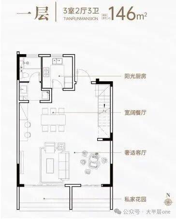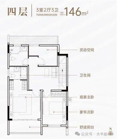 三、空间革命,146㎡叠墅演绎极致生活美学 【下叠·庭院时光】 146㎡阔境空间,7米面宽南向双开间(3.9m+3m),三房两厅三卫设计,两房朝南沐浴充足阳光。约16.2㎡私家庭院,可植竹养荷,亦可品茗会友,让自然与建筑共生共荣。 【上叠·星空之境】 同面积段上叠产品,以双层空间重构垂直生活美学。7米面宽配合全景落地窗,将周庄的晨昏四季尽收眼底。三卫设计实现主客分离,私密性与仪式感兼得,满足精英阶层对品质生活的苛求。