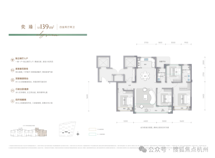 建面约139㎡四房两卫户型:堪称改善家庭的终极选择:独立梯厅入户,类一梯一户设计,尊享私密与静谧四开间朝南;约14米奢阔面宽,阳光满室铺展;餐客一体宽境,约7米阔绰开间,满足大家庭聚会需求;南面双联阳台,瞰景晾晒两全,兼具生活与诗意。