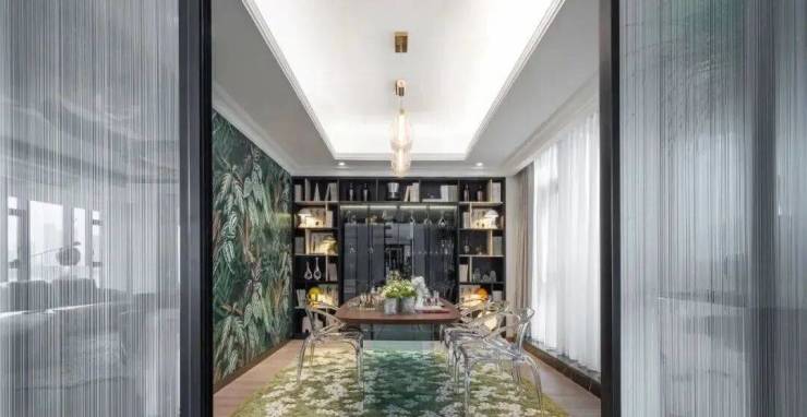 与入户露台绿意一窗之隔的,是整面郁郁葱葱的雨林,由瑞典Rebel Walls的专有数位技术特别定制处理而成,仿佛进去就能远离尘嚣。