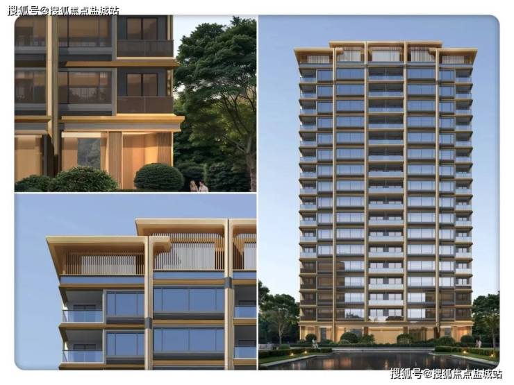 1⃣、外立面 为四面铝板+部分石材。铝板镶嵌金色金属线条,温暖色调打破冰冷灰系,斜角披檐设计承袭智慧,彰显绿城中式底蕴。
