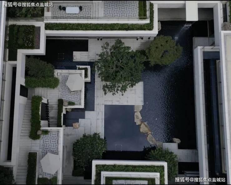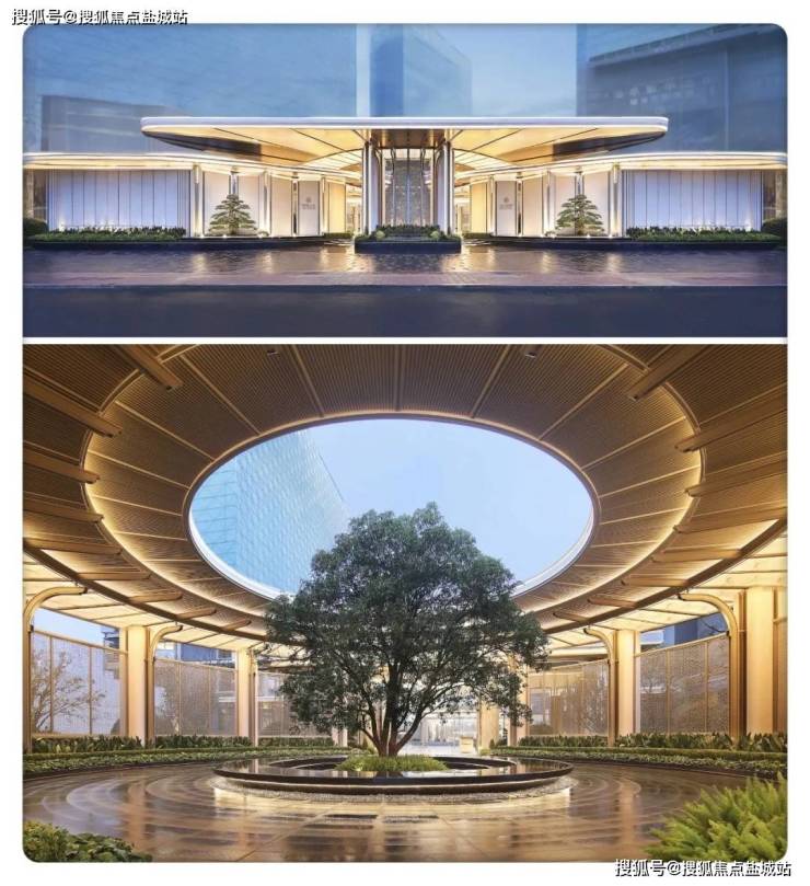 2⃣、大门 为”三重归家礼序“近60米超长景墙,辅以三重檐建筑,搭配20余米维纳灰石材景墙,迎宾罗汉松苍劲挺立于安哥拉黑光面水景之上。前院则采用‘藻井天幕’暗合天圆地方的东方宇宙观,藻井落中‘百年古桂’贵气迎门,海纳百川。