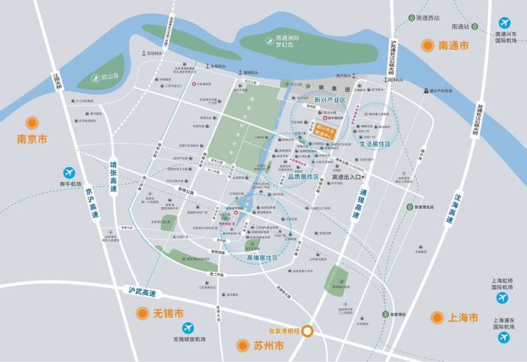 张家港东倚上海,南连苏州、无锡,西邻常州,北与南通隔江相望,与周边大中城市车程均在一小时左右,交通优势明显。