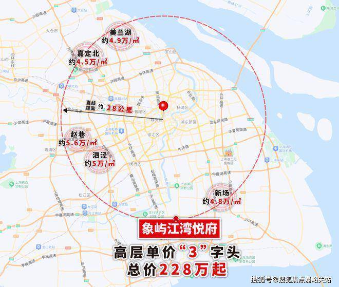 项目直线距离人民广场约28公里。以相同半径画圈,同一纬度的圆周板块,新房价格普遍约4.8万/㎡,部分超过5万/㎡。