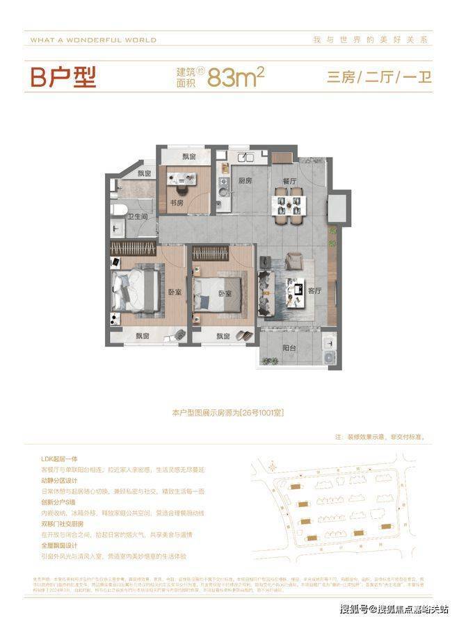 同时厨房双移门设置,打开了室内视野。做饭的同时能与客厅里的家人随时互动,打破了原本厨房的“孤独感”,赋予家庭更多情感交流。建面约83㎡不仅做到了3房极致功能,三开间朝南+动静分区+全卧飘窗,给家庭创造了更舒适的户型空间。