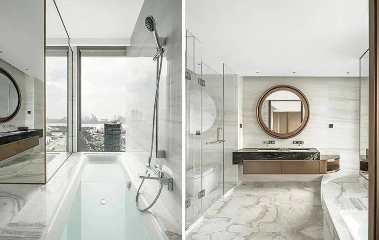 杭 州 壹 号 院主卫以优雅的白色大理石铺装而成,纵向延申的浴缸可以俯瞰整个奥体板块以及钱江新城。位于浴缸左侧的柱子在设计师的改造下变成通透镜面,反射城市景观,夜幕降临,城市灯光与霓虹一览无余。