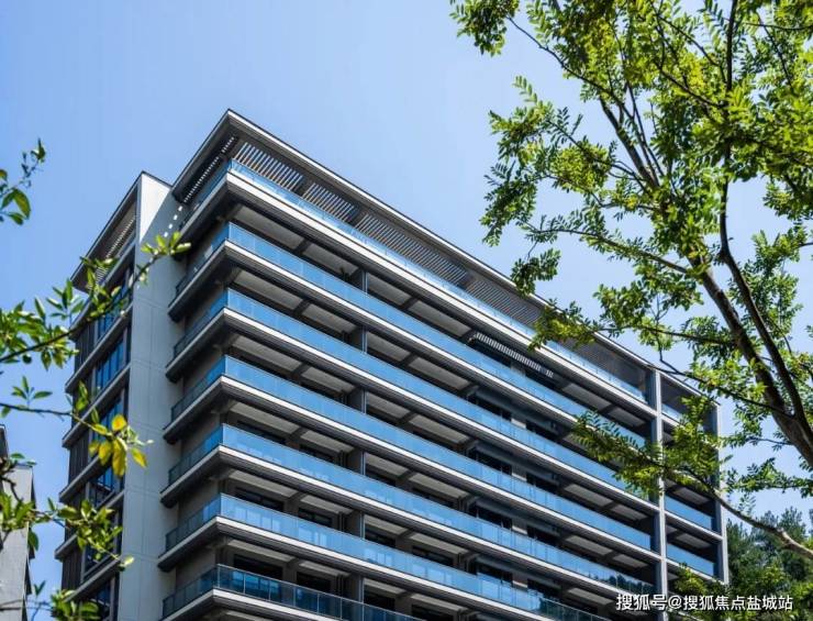 🌟立面采用青灰色,一层石材干挂,铝板勾勒出几何线条,阳台采用玻璃栏杆,实现简约纯净的建筑立面,与低缓的青绿森林融为一体。