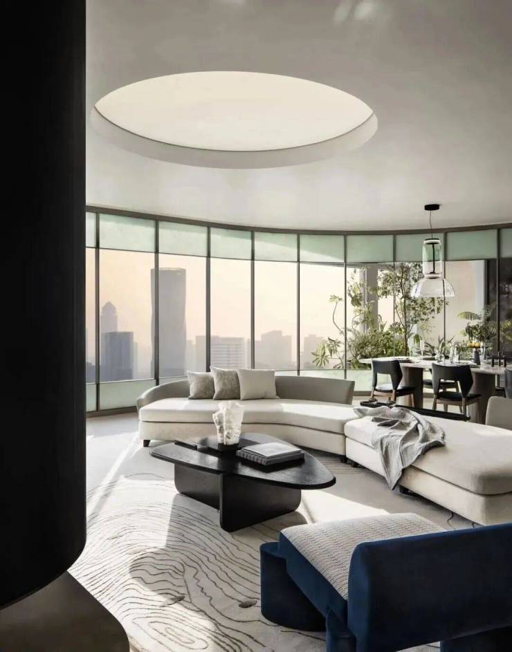 •外立面:蓝灰色中空Low-E玻璃 + 浅灰色铝板,光影流转间与江岸同频呼吸•灯光设计:黎欧思照明操刀,与万象城、来福士同源,夜幕中温润如玉•总规模:全案仅5席“天际平墅”组团•户型面积:每户约1064㎡(标准层),层高3.9米!