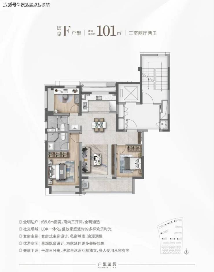 - **高层101㎡经典三房**:南北通透+三开间朝南,客餐厨一体化+IMAX级观景阳台,主卧套房设计,新风地暖空调三大件全配,精装交付即享品质;
