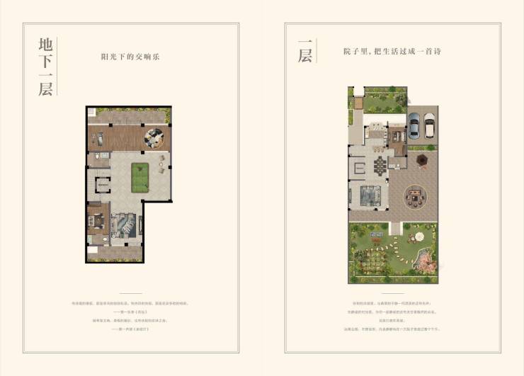 一楼:均采用了南北双入户的方式,带来了南北通透的连体超大花园,停车位设在北向,并且拥有独立的观景餐厅设计,还额外设计了超大入户平台,为住户提供了更多的便利;