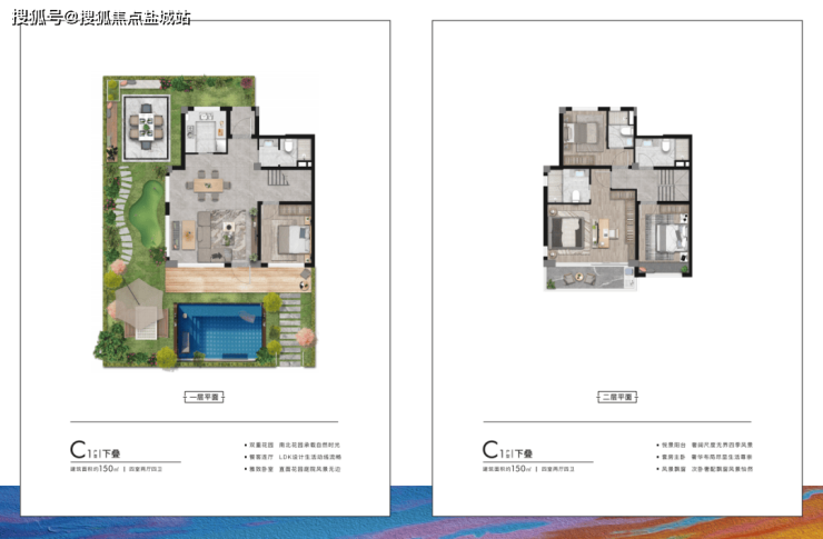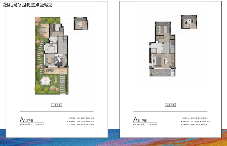 来看户型,面积段有两种——建面约95㎡下叠、上叠;建面约150㎡下叠、上叠。