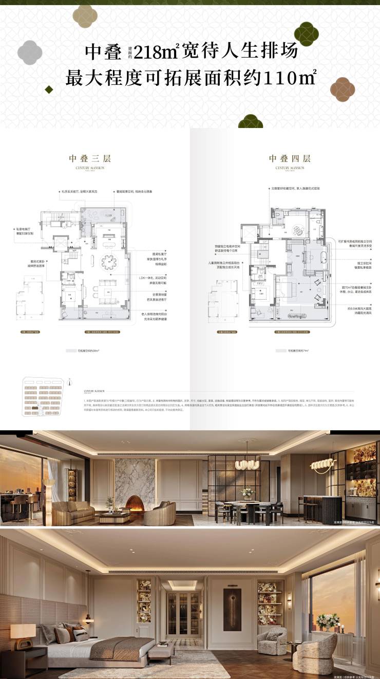 建面约218㎡中叠,可拓展面积约110㎡。享潮流社交场与闲逸景台,总裁级起居室超70㎡。