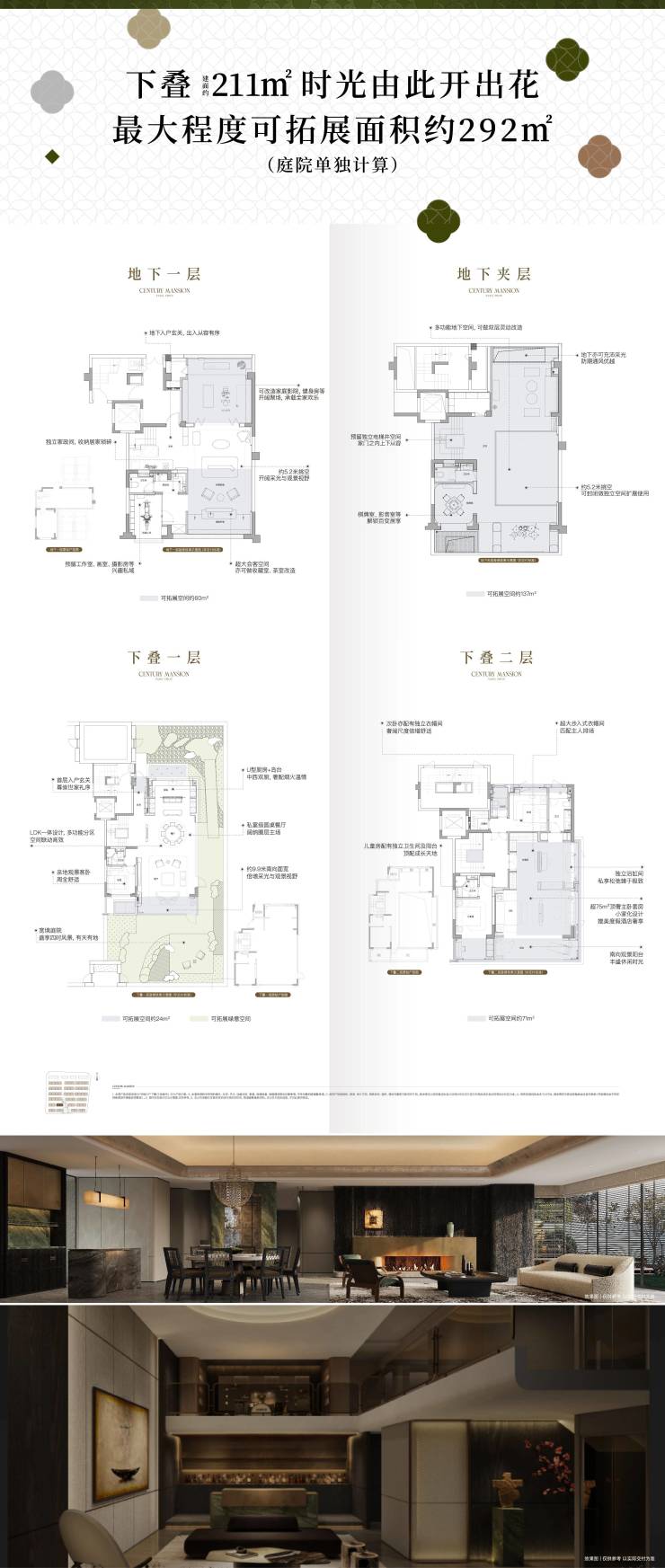 建面约211㎡下叠,可拓展面积达到约292㎡。享一方院落天地,首层奢阔客厅,双层地下空间。