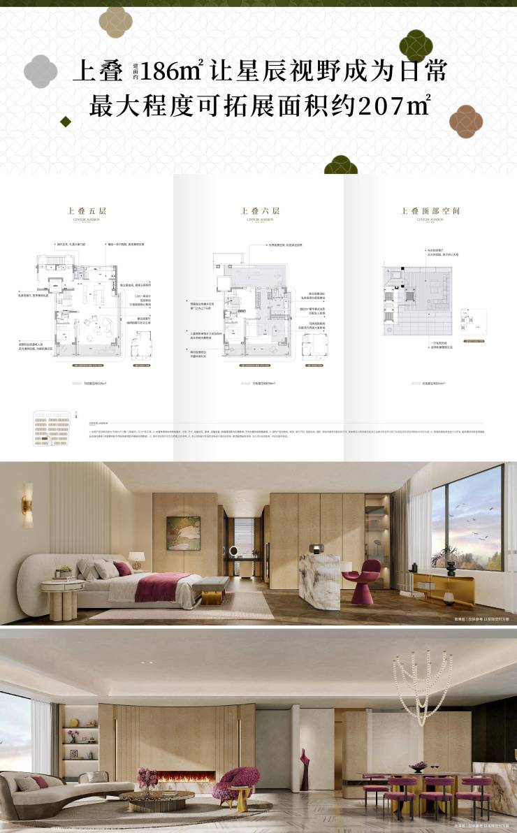 建面约186㎡上叠,可拓展面积达到约207㎡。享超60㎡总裁级起居室,奢阔空中花园。
