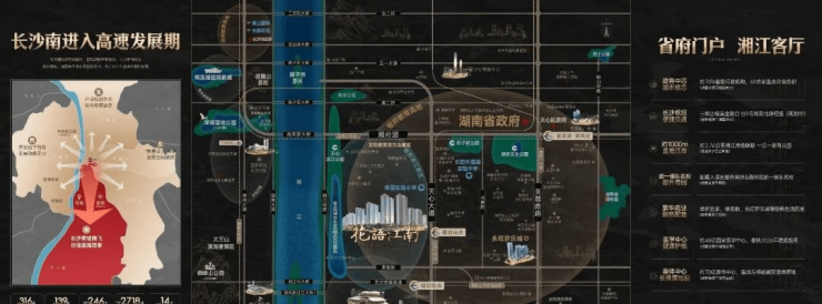 省府主城核心,总投资约316亿元,定位为“省府门户,湘江客厅”,坐享约2.76公里滨江岸线,约70%省级行政机构,60余家重点企业总部林立,约70亿奥体中心,约48亿国家医学中心等省级重点项目环伺,区域发展进入高速发展期。