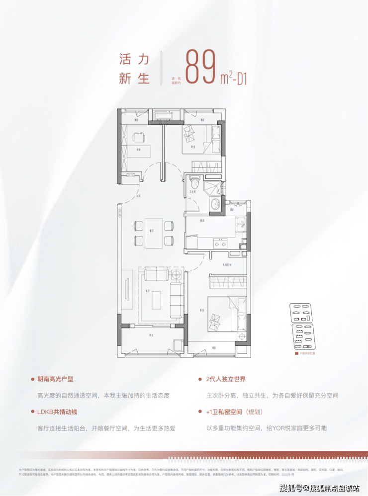 建面约89㎡3房,除了前面说到的三开间户型,还有一个两开间户型,基本见不到面积浪费,空间利用到极点!