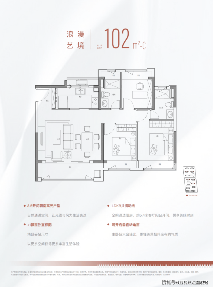 102㎡三房两厅两卫的舒适户型, 约5.4m横厅设计,3.5开间朝南,得房率约80%左右;每间房均有飘窗, 全屋飘窗共享有额外的面积约13㎡,在市场上也是少有的产品。