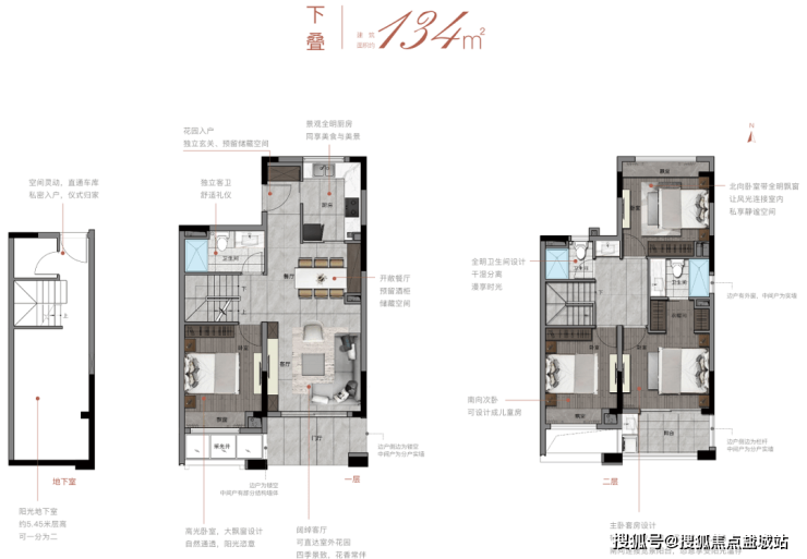 下叠四室两厅三卫设计,由地上2层和地下1层组成, —楼客厅南向可直达室外花园,享有亲近自然、阳光、绿地的惬意生活