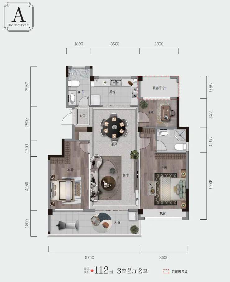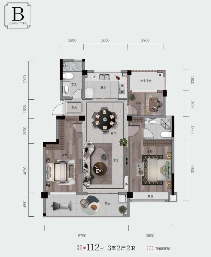 相较于目前市面上大部分外立面只做了真实漆的楼盘,隐舟府洋房、排屋的一、二层全部是干挂石材,主体外墙为浅色仿石涂料搭配大开间玻璃栏板,顶层上部采用铝板外檐。这样朴实无华的外立面设计,在1字头的楼盘中脱颖而出,整体简约大气,又不失精致的视觉效果!