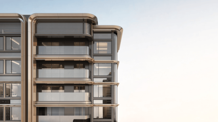整幢建筑是有尤安团队设计完成,采用经典的现代海派风格,强调功能注意和简洁的设计手法,上下贯通线条使得板楼立面分段,采用精致铝板板、金属线条等材料打造,形成了三段式增加了阴影感和立体感。同时,采用圆弧倒角收边,让整个建筑更符合东方美学。
