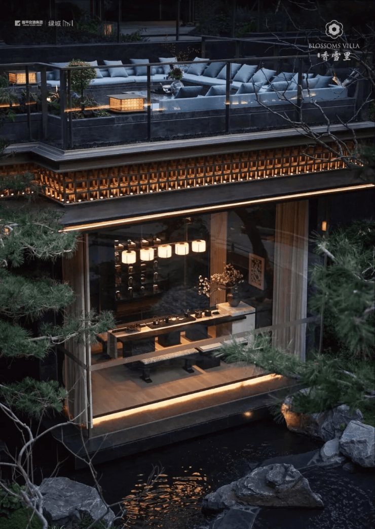 绿城对东方美学的探索,在香雪里项目中抵达新的高度。以约 1.3 低密容积率为画布,LEAP建筑设计总监程华锋以宋代《溪山行旅图》为灵感,勾勒出 “山 - 瀑 - 林 - 溪 ” 四重境界。