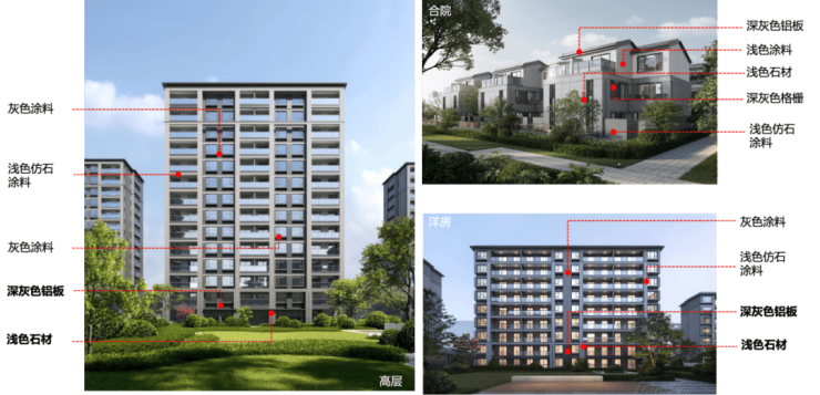 星缦和润城整体建筑风貌以精致有力的线条为主要构成元素,且具有简洁通透的立面。项目建筑设计合理呼应这两种城市设计元素。灰白对比的主色调,突出典雅的调性。保留宋式传统元素,并通过大面积玻璃、涂料、首二层石材+铝线条等简洁而现代手法,匹配现代品质生活。
