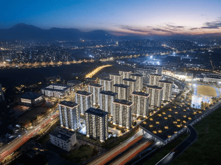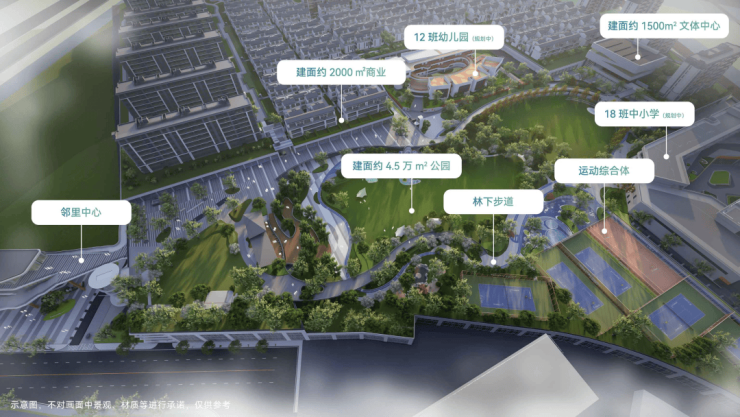 整个项目由两宗地块组成,占地约425亩,总建筑面积约48万㎡。是一座涵盖约4.5万㎡公园、幼儿园、九年一贯制学校、文体中心、邻里中心等复合业态的超大“公园城市”。