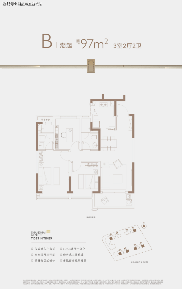 建面约95-97㎡3房2卫,2卫的设计保证了早晚高峰抢厕所的问题,并且主卧套房设计也保证了主人的私密空间。
