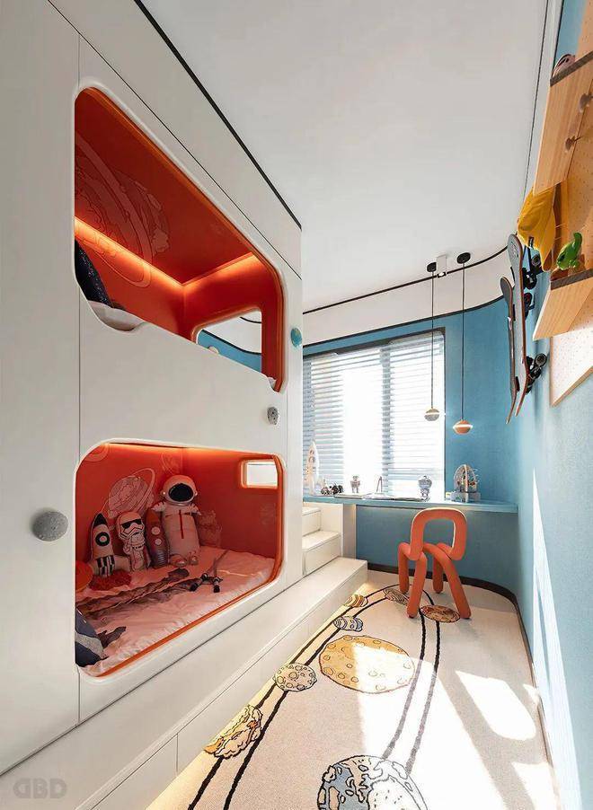 The room of the children's room still retains the concept of childlike innocence, a large number of plush toys and hands can reveal the children's love. A large number of planetary forms and aircraft models show the soaring and dream in space.