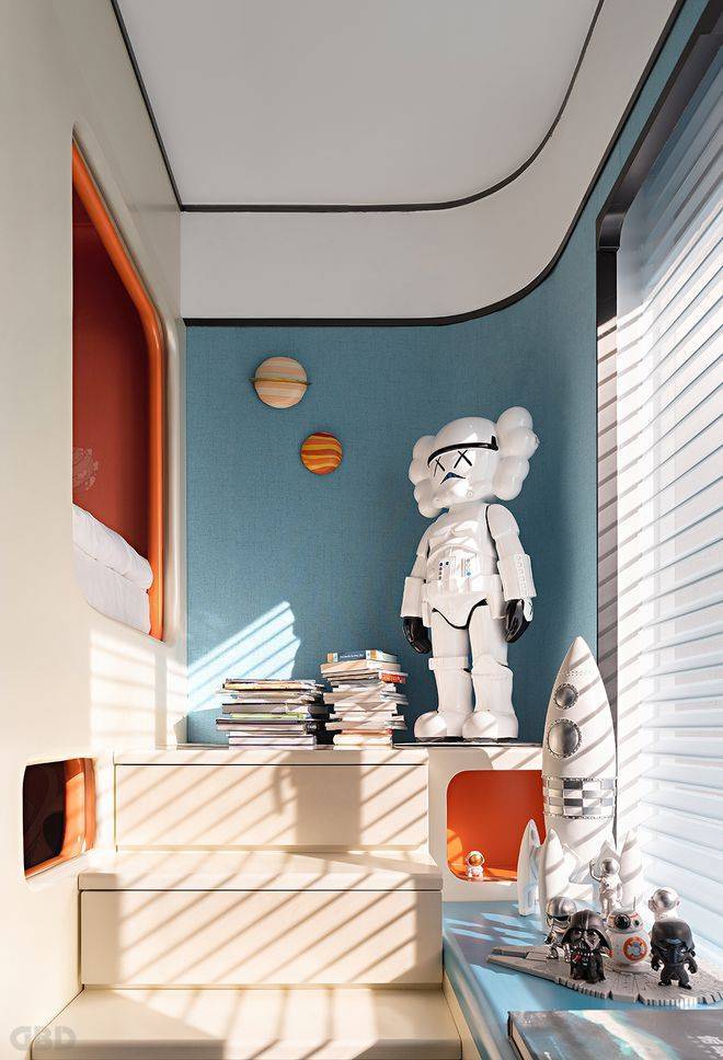 儿童房的房间当中依旧保留了同志的童真理念,大量的毛绒玩具和手办都能够透露出儿童的喜爱。大量的行星形态以及飞机模型展示出空间当中的翱翔与梦幻。
