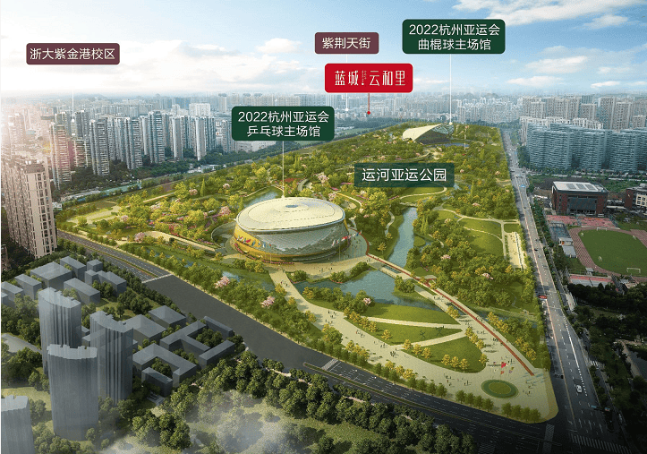 近邻约700亩的运河亚运公园(在建),该园投入使用后将成为集城市绿肺公园和文体综合新地标为一体的杭州最大综合性体育公园,也是2022年亚运会乒乓球和曲棍球赛事的主会场;未来将成为申花乃至全杭州的全民健身中心。