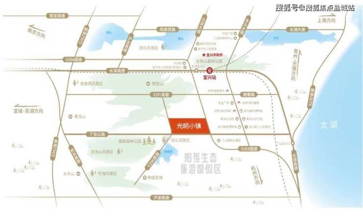 光明小镇地理位置优越,交通便捷,5分钟到达丁蜀宝龙商圈,10分钟车程就可以到达宜兴高铁站、G25 长深高速路口,20分钟左右即可到达宜兴市区;沪苏湖高铁预计2024年通车,未来一小时内能到达上海在内的多个长三角重要城市