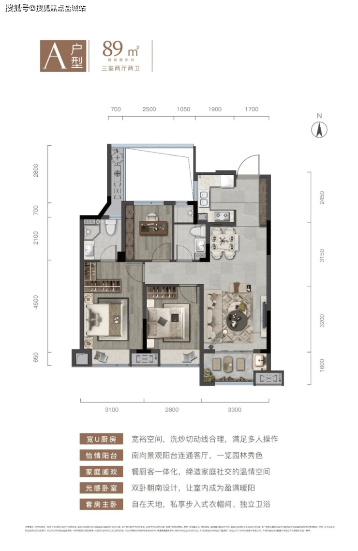 建面约89m²全能大三房,主次卧空间充沛,主卧套房式设计、三开间朝南向、双卫设计,空间多得;建筑面积约105㎡大三房全明户型,双卧朝南、拥约7米南向景观阳台、餐客一体横向约6米宽幅采光。更高的得房率,安放生活多重逸趣。