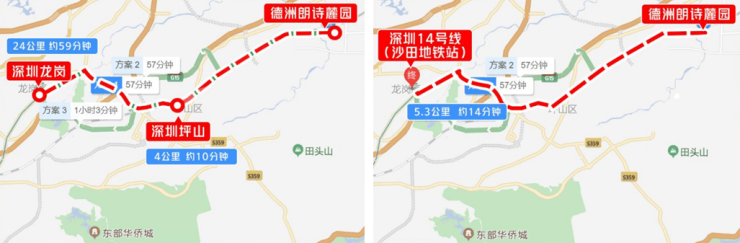 与坪山距离4公里开车仅需10分钟,与龙岗距离24公里,开车到深圳地铁14号线-沙田站,仅需14分钟。