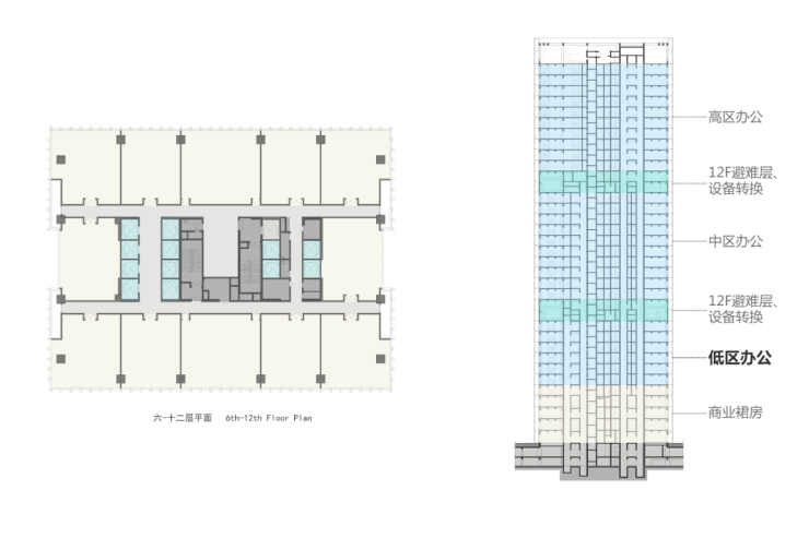 芯光大厦是一栋150米超高层,共35层。其中1-4层为挑高大堂和商业裙房。塔楼标准层面积约1800㎡,办公层高4.15m,净高2.75m。在超高层塔楼设置两处避难层,两个避难层自然地将塔楼分为低中高三区,每区各有4台电梯,以及一部上下贯通的消防梯兼货梯,共计13台电梯。