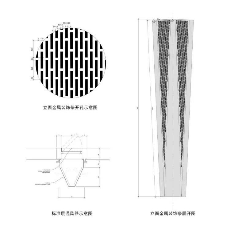 T1塔楼标准段幕墙系统:标准塔身采用竖明横隐框架式幕墙,上下左右错动的折线装饰铝板即是装饰元素,也隐藏了背后的开启扇,通过侧面的穿孔板达到通风效果。